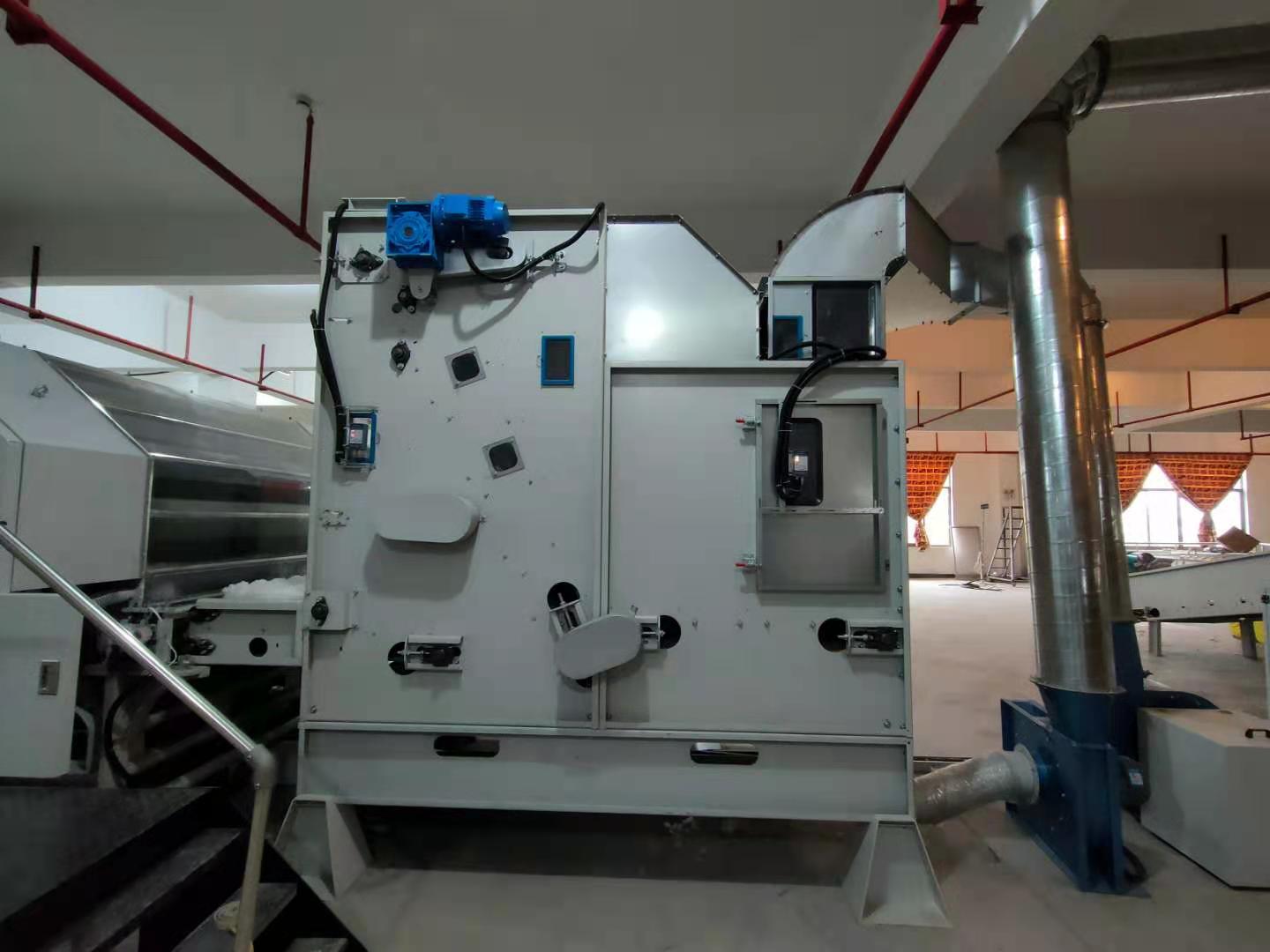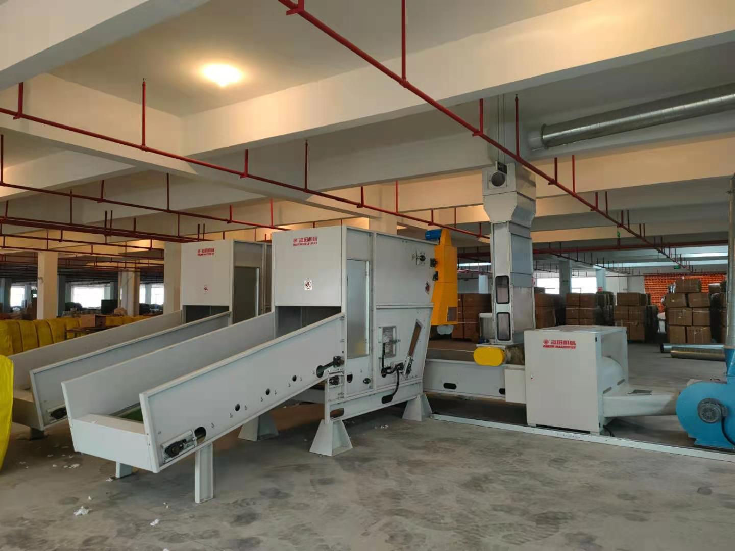 本生產(chǎn)線專為化纖填充被套的自動(dòng)化生產(chǎn)設(shè)計(jì),涵蓋從纖維梳理、填充物鋪網(wǎng)到被套封裝的全流程,具有高效、精準(zhǔn)、衛(wèi)生等特點(diǎn),適用于家紡、酒店用品、醫(yī)療寢具等領(lǐng)域的大規(guī)模生產(chǎn)。 化纖原料預(yù)處理 原料開松:將壓縮的化纖塊(如滌綸、PP棉等)通過開松機(jī)打散,形成蓬松狀態(tài)。 纖維梳理:通過高速梳理機(jī)將纖維梳理成均勻的網(wǎng)狀結(jié)構(gòu),確保填充物無結(jié)塊、厚度一致。 填充物鋪網(wǎng)與定型 交叉鋪網(wǎng)機(jī)將梳理后的纖維多層疊加,調(diào)節(jié)克重和蓬松度。 短程熱風(fēng)定型(可選):通過低溫?zé)犸L(fēng)穩(wěn)定纖維結(jié)構(gòu),增強(qiáng)回彈性。 被套裝配與封裝 自動(dòng)裁切:按預(yù)設(shè)尺寸切割填充層,匹配被套外殼。 充填裝套:通過充填機(jī)將纖維層均勻填入預(yù)制的被套外殼,避免分布不均。 絎縫/封口:采用多針絎縫機(jī)固定填充物,或通過超聲波封口機(jī)完成密封(防螨抗菌需求場景)。 質(zhì)檢與包裝 重量檢測:確保每床被子填充量符合標(biāo)準(zhǔn)。 金屬探測:排除生產(chǎn)過程中可能的金屬雜質(zhì)。 自動(dòng)折疊包裝:真空壓縮(可選)后裝箱。 高效率:全自動(dòng)化流程,日產(chǎn)量可達(dá)2000~5000床(視規(guī)格而定)。 精準(zhǔn)控制:PLC系統(tǒng)調(diào)節(jié)填充量、絎縫間距等參數(shù),誤差≤2%。 衛(wèi)生環(huán)保:封閉式填充環(huán)節(jié)減少粉塵污染,支持可回收化纖材料。 靈活適配:可快速切換不同被套尺寸(單人/雙人/加大)和填充克重。 智能分揀系統(tǒng):聯(lián)動(dòng)MES系統(tǒng)實(shí)現(xiàn)訂單批次管理。 抗菌處理模塊:在線噴涂抗菌劑(適用于醫(yī)療、兒童用品)。生產(chǎn)線概述