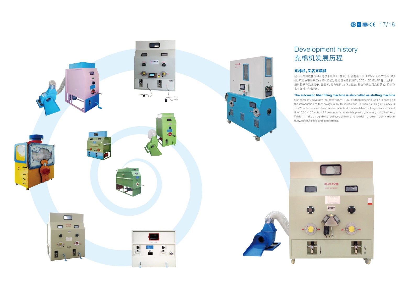 自主開發(fā)研制新一代HJCM-1250(1200)式充棉(填)機,填充效率是手工的15-20倍,能充填長纖和短纖,0.7D- 15D棉、PP棉、碎海綿、邊角料、塑料粒子和泡沫粒子、喬麥等,使布玩具、沙發(fā)、坐墊、靠墊和床上用品更蓬松、柔軟和富有彈性,手感舒適。 | |