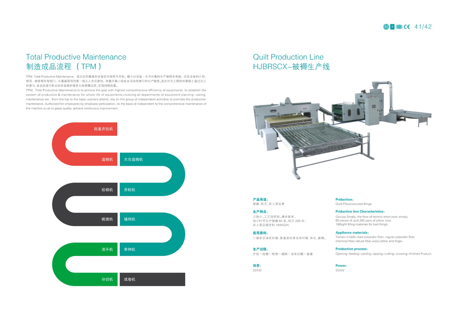 本生產(chǎn)線專為化纖填充被套的自動(dòng)化生產(chǎn)設(shè)計(jì),涵蓋從纖維梳理、填充物鋪網(wǎng)到被套封裝的全流程,具有高效、精準(zhǔn)、衛(wèi)生等特點(diǎn),適用于家紡、酒店用品、醫(yī)療寢具等領(lǐng)域的大規(guī)模生產(chǎn)。 化纖原料預(yù)處理 原料開松:將壓縮的化纖塊(如滌綸、PP棉等)通過(guò)開松機(jī)打散,形成蓬松狀態(tài)。 纖維梳理:通過(guò)高速梳理機(jī)將纖維梳理成均勻的網(wǎng)狀結(jié)構(gòu),確保填充物無(wú)結(jié)塊、厚度一致。 填充物鋪網(wǎng)與定型 交叉鋪網(wǎng)機(jī)將梳理后的纖維多層疊加,調(diào)節(jié)克重和蓬松度。 短程熱風(fēng)定型(可選):通過(guò)低溫?zé)犸L(fēng)穩(wěn)定纖維結(jié)構(gòu),增強(qiáng)回彈性。 被套裝配與封裝 自動(dòng)裁切:按預(yù)設(shè)尺寸切割填充層,匹配被套外殼。 充填裝套:通過(guò)充填機(jī)將纖維層均勻填入預(yù)制的被套外殼,避免分布不均。 絎縫/封口:采用多針絎縫機(jī)固定填充物,或通過(guò)超聲波封口機(jī)完成密封(防螨抗菌需求場(chǎng)景)。 質(zhì)檢與包裝 重量檢測(cè):確保每床被子填充量符合標(biāo)準(zhǔn)。 金屬探測(cè):排除生產(chǎn)過(guò)程中可能的金屬雜質(zhì)。 自動(dòng)折疊包裝:真空壓縮(可選)后裝箱。 高效率:全自動(dòng)化流程,日產(chǎn)量可達(dá)2000~5000床(視規(guī)格而定)。 精準(zhǔn)控制:PLC系統(tǒng)調(diào)節(jié)填充量、絎縫間距等參數(shù),誤差≤2%。 衛(wèi)生環(huán)保:封閉式填充環(huán)節(jié)減少粉塵污染,支持可回收化纖材料。 靈活適配:可快速切換不同被套尺寸(單人/雙人/加大)和填充克重。 智能分揀系統(tǒng):聯(lián)動(dòng)MES系統(tǒng)實(shí)現(xiàn)訂單批次管理。 抗菌處理模塊:在線噴涂抗菌劑(適用于醫(yī)療、兒童用品)。生產(chǎn)線概述