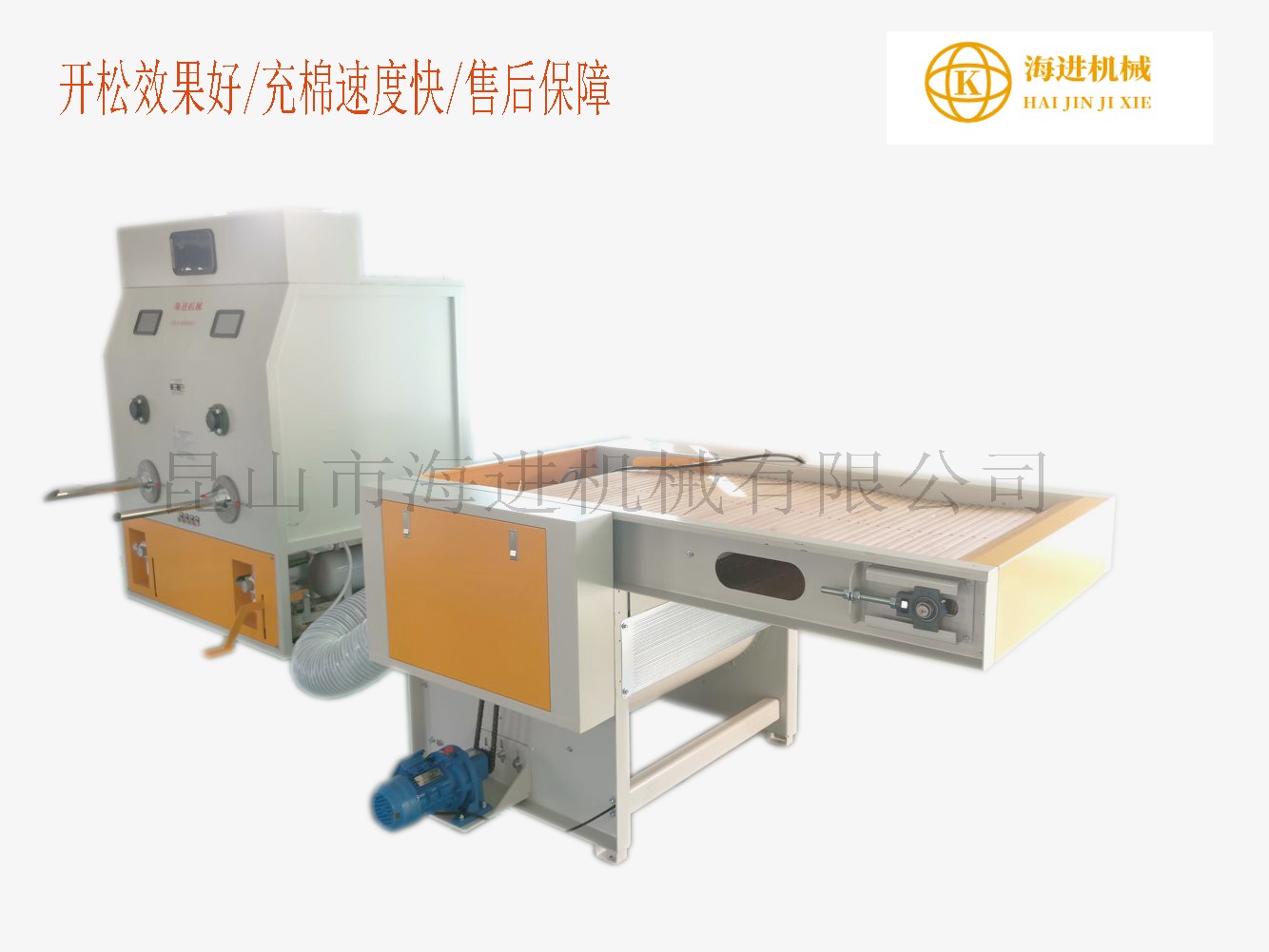自主開發(fā)研制新一代HJCM-1250(1200)式充棉(填)機(jī),填充效率是手工的15-20倍,能充填長纖和短纖,0.7D- 15D棉、PP棉、碎海綿、邊角料、塑料粒子和泡沫粒子、喬麥等,使布玩具、沙發(fā)、坐墊、靠墊、寵物墊和床上用品更蓬松、柔軟和富有彈性,手感舒適。 產(chǎn)品名稱:化纖開松充棉一體機(jī)(開松+充填流水線)